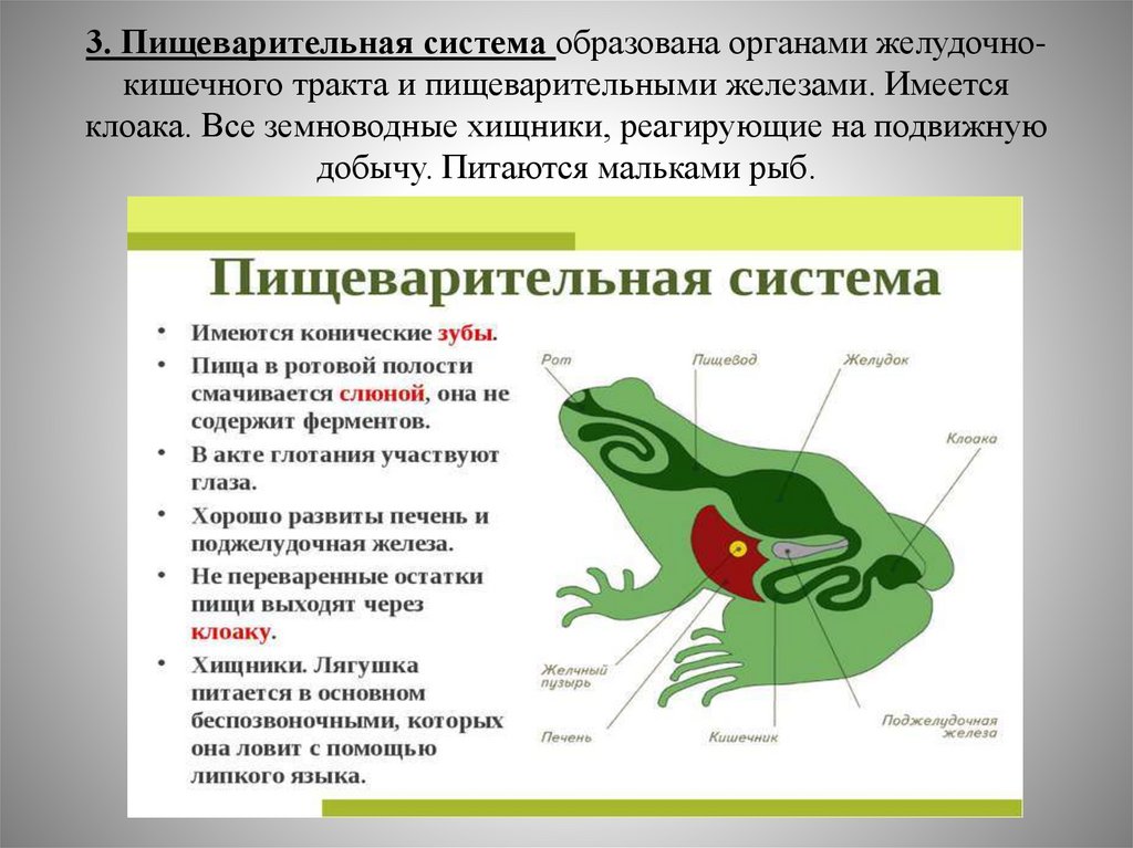 3. Пищеварительная система образована органами желудочнокишечного тракта и пищеварительными железами. Имеетсяклоака. Все земноводные хищники, реагирующие на подвижную