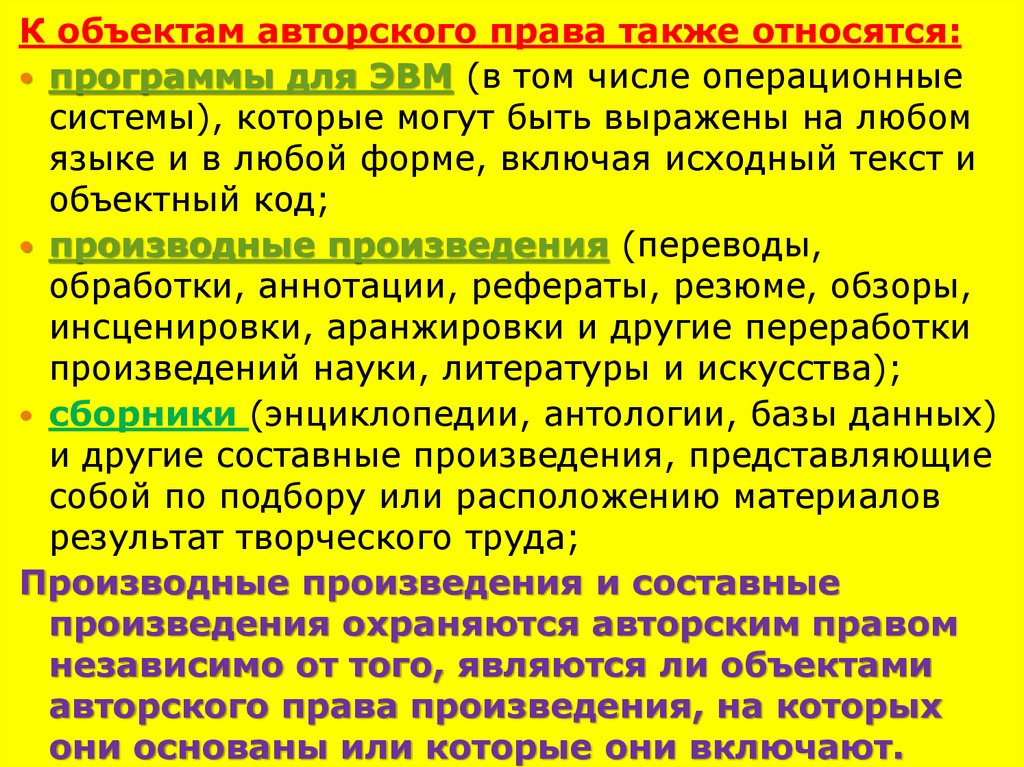 К объектам авторского права также относятся:программы для ЭВМ (в том числе операционные