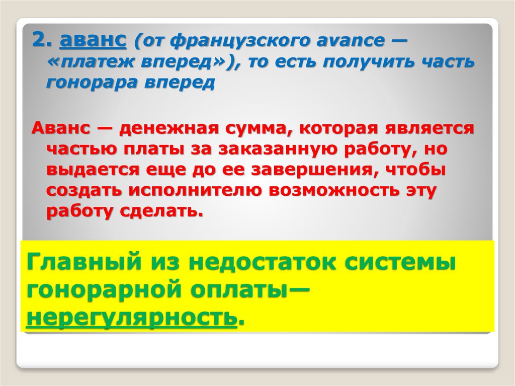 2. аванс (от французского avance —«платеж вперед»), то есть получить часть