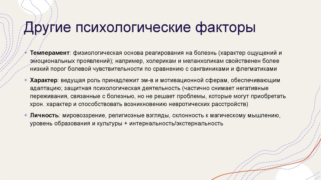 Другие психологические факторы+ Темперамент: физиологическая основа реагирования на болезнь (характер ощущений и