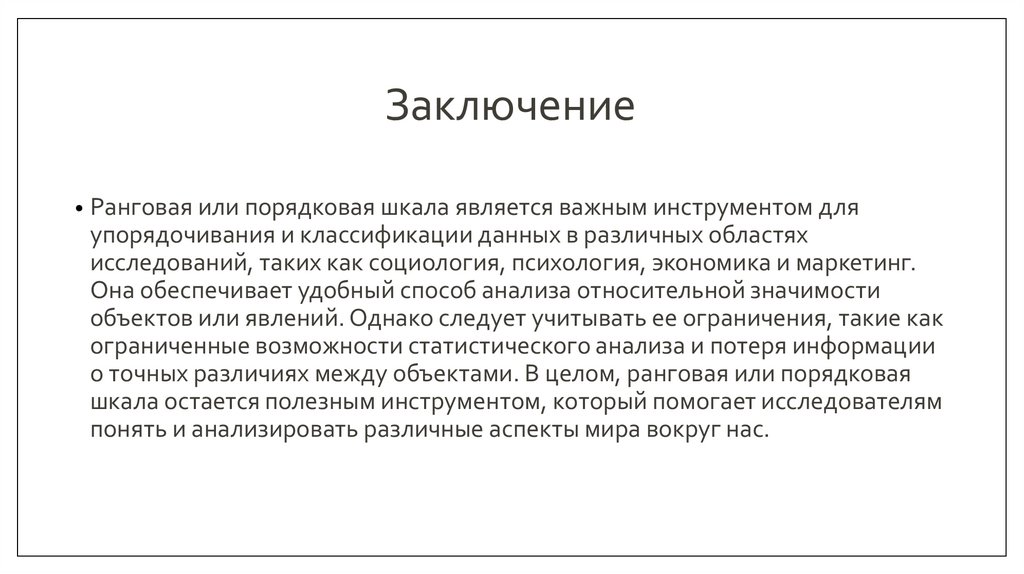 Заключение• Ранговая или порядковая шкала является важным инструментом для