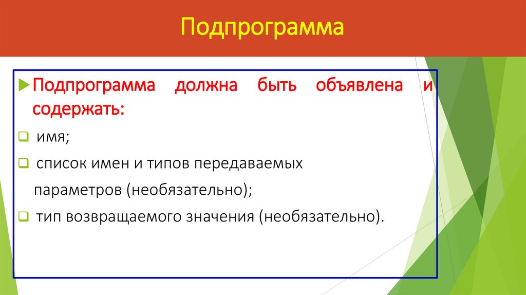 ПодпрограммаПодпрограмма - это отдельная часть программы, имеющая