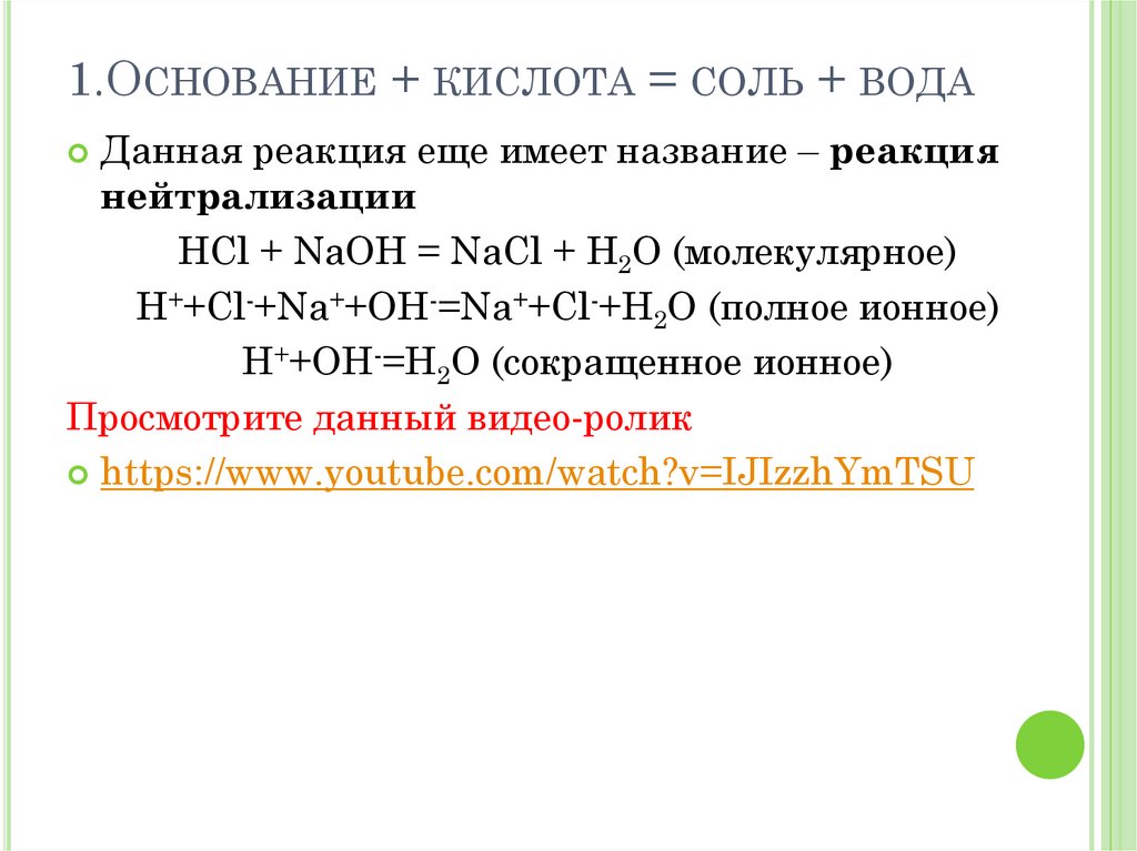 1.ОСНОВАНИЕ + КИСЛОТА = СОЛЬ + ВОДАДанная реакция еще имеет название – реакция