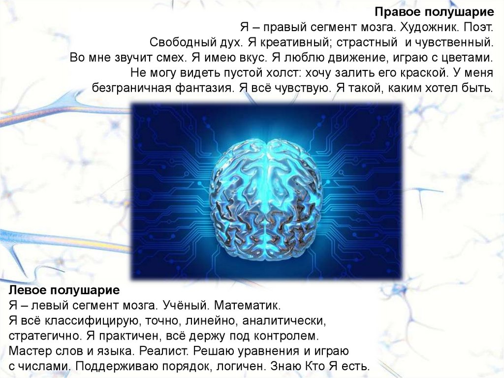 полушария техники и деталей, а от правого – образов,