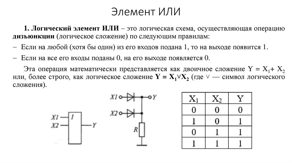 или, более строго, как логическое сложение Y = X1˅X2 (где ˅ — символ логического