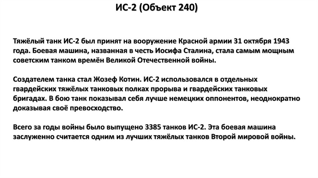 ИС-2 (Объект 240)Тяжёлый танк ИС-2 был принят на вооружение Красной армии 31 октября 1943