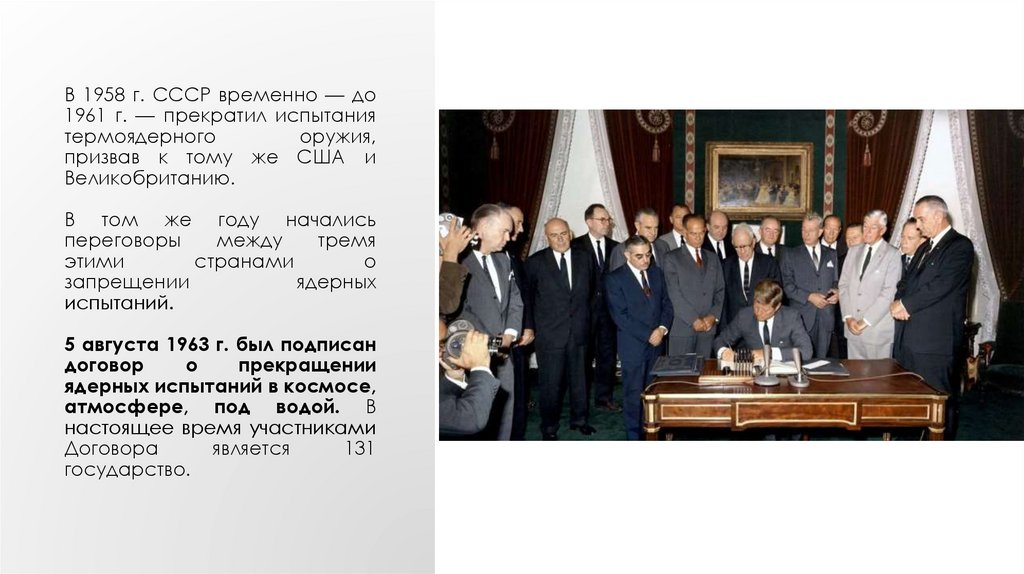 В 1958 г. СССР временно — до1961 г. — прекратил испытания