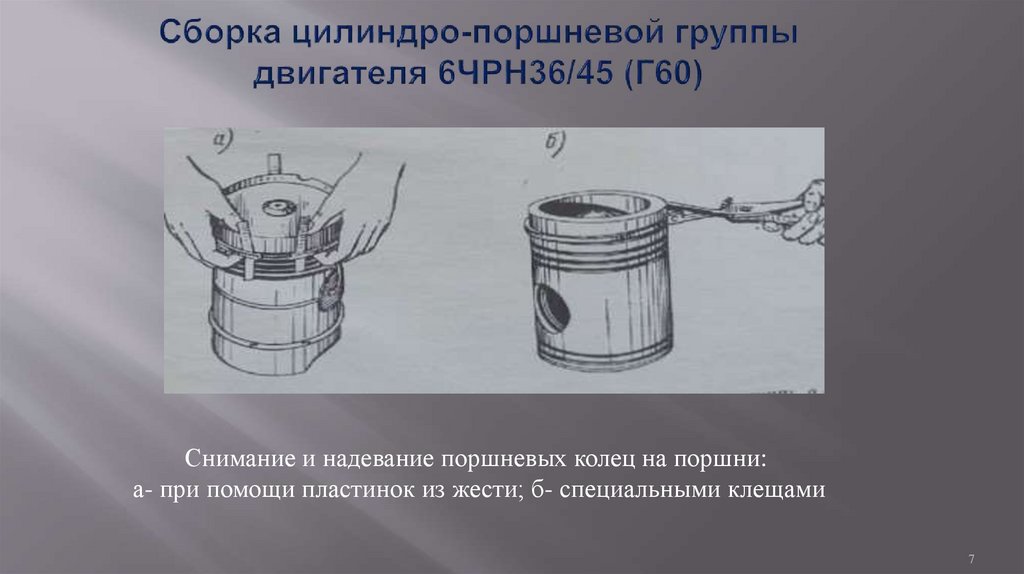 Снимание и надевание поршневых колец на поршни:а- при помощи пластинок из жести; б- специальными клещами