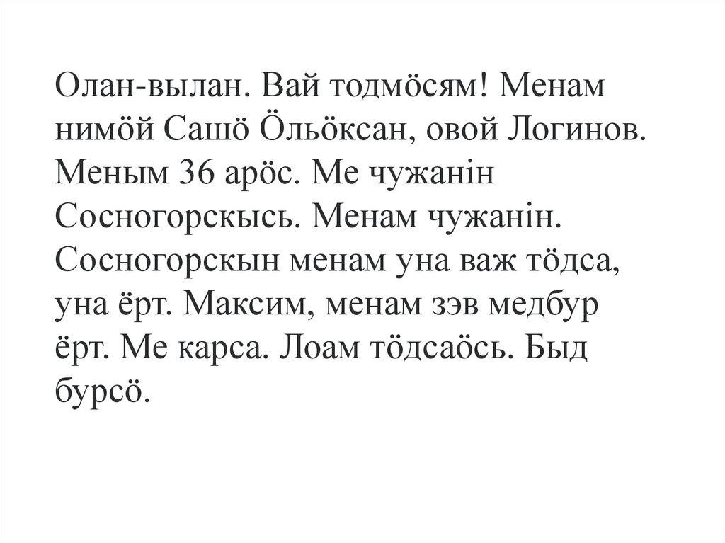 Олан-вылан. Вай тодмöсям! Менамнимӧй Сашö Ӧльӧксан, овой Логинов.