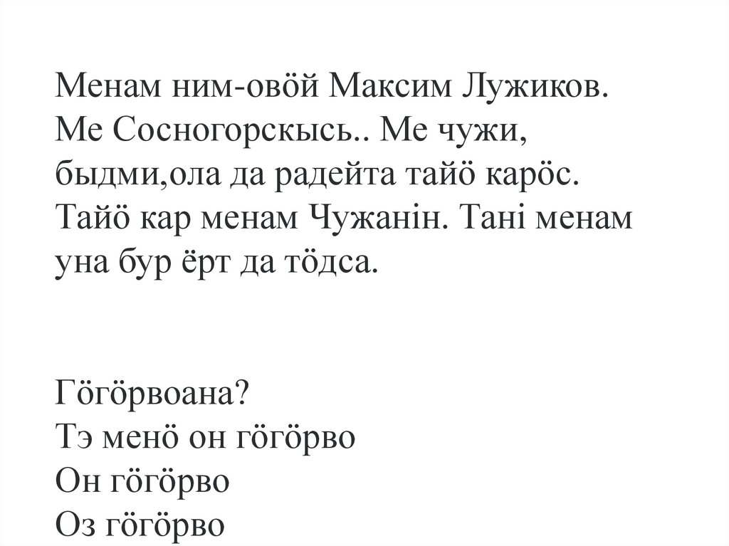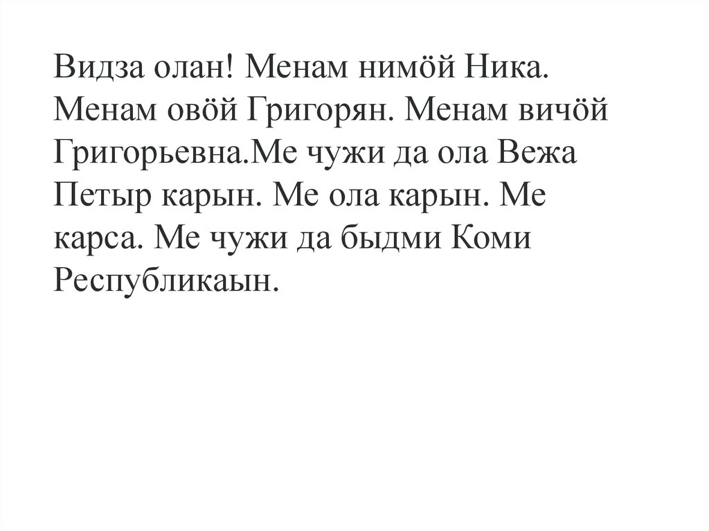 Видза oлан! Менам нимöй Ника.Менам овöй Григорян. Менам вичöй