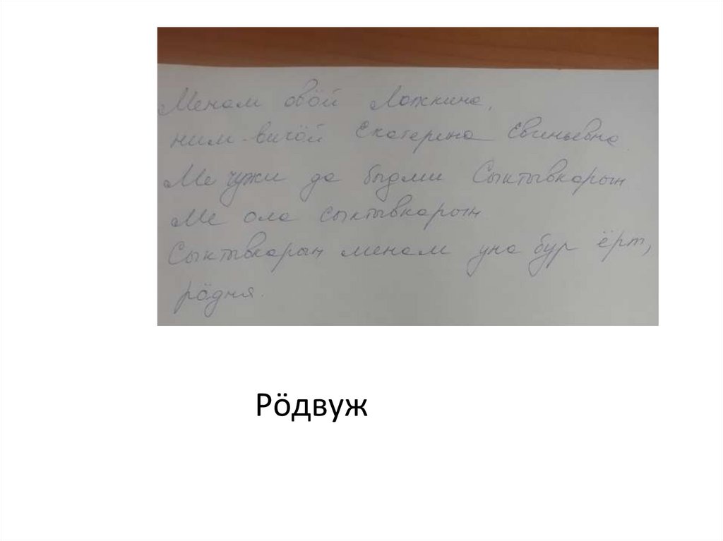 Менам нимöй Надя, менам овöйКоджебаш. Ме чужи да бадми