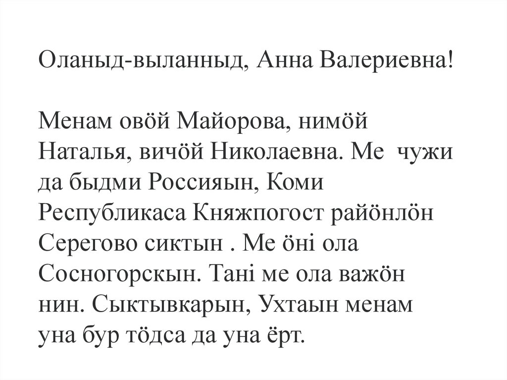 Оланыд-выланныд, Анна Валериевна!Менам овöй Майорова, нимöй