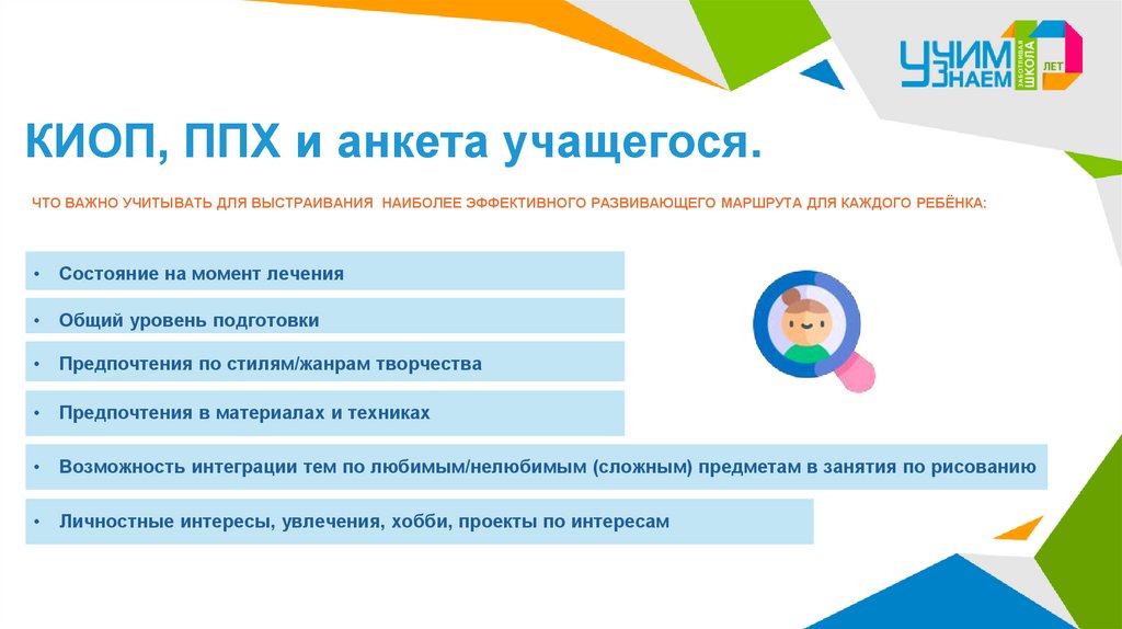 КИОП, ППХ и анкета учащегося.ЧТО ВАЖНО УЧИТЫВАТЬ ДЛЯ ВЫСТРАИВАНИЯ НАИБОЛЕЕ ЭФФЕКТИВНОГО РАЗВИВАЮЩЕГО МАРШРУТА ДЛЯ КАЖДОГО РЕБЁНКА: