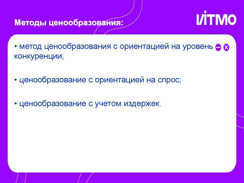 Методы ценообразования:• метод ценообразования с ориентацией на уровень