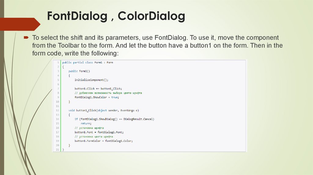 FontDialog , ColorDialogTo select the shift and its parameters, use FontDialog. To use it, move the component