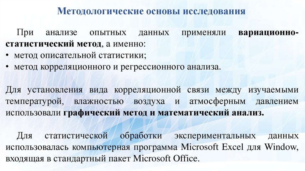 Методологические основы исследованияПри анализе опытных данных применяли