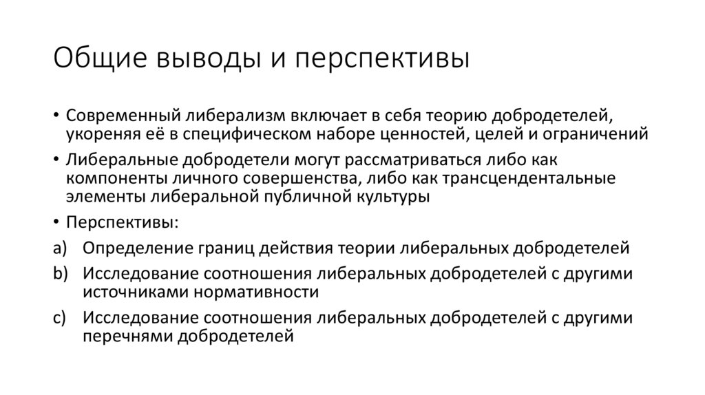 Общие выводы и перспективы• Современный либерализм включает в себя теорию добродетелей,