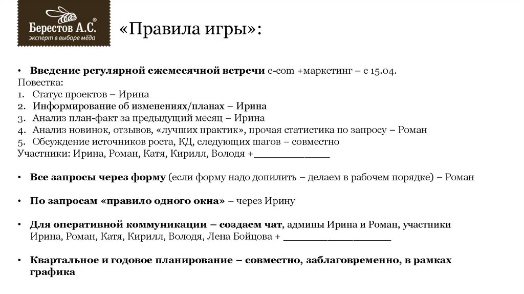 «Правила игры»:• Введение регулярной ежемесячной встречи e-com +маркетинг – с 15.04.