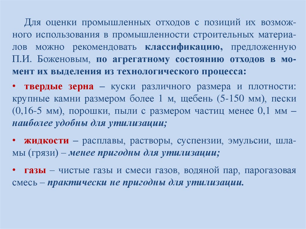 Для оценки промышленных отходов с позиций их возможного использования в промышленности строительных материалов можно рекомендовать классификацию, предложеннуюП.И. Боженовым, по агрегатному состоянию отходов в момент их выделения из технологического процесса: