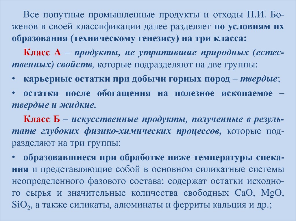 Все попутные промышленные продукты и отходы П.И. Боженов в своей классификации далее разделяет по условиям ихобразования (техническому генезису) на три класса: