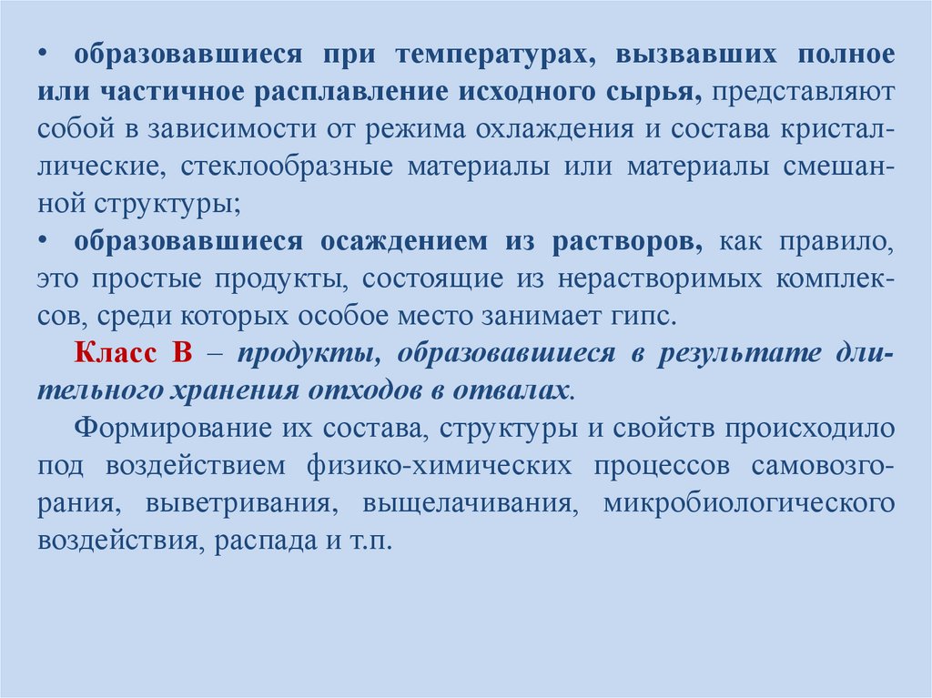 Класс В – продукты, образовавшиеся в результате длительного хранения отходов в отвалах.