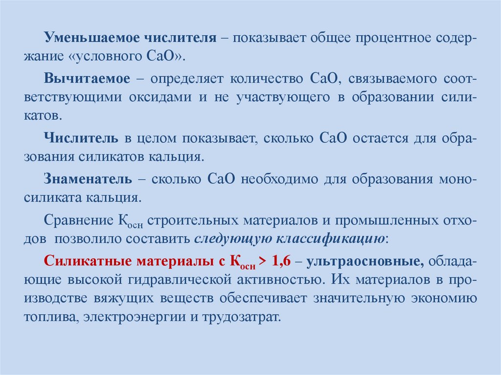 Уменьшаемое числителя – показывает общее процентное содержание «условного СаО».Вычитаемое – определяет количество СаО, связываемого соответствующими оксидами и не участвующего в образовании силикатов.