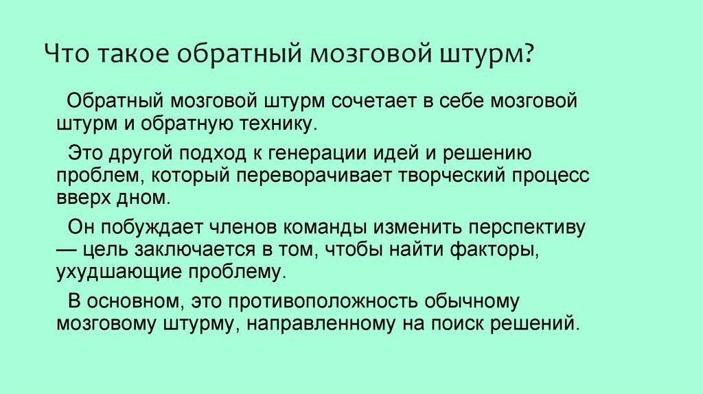Что такое обратный мозговой штурм?Обратный мозговой штурм сочетает в себе мозговой