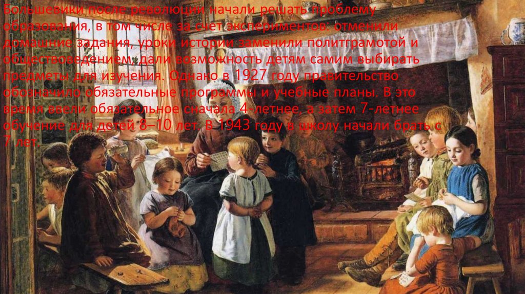 Большевики после революции начали решать проблемуобразования, в том числе за счет экспериментов: отменили