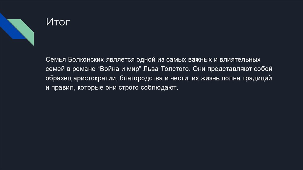 ИтогСемья Болконских является одной из самых важных и влиятельных