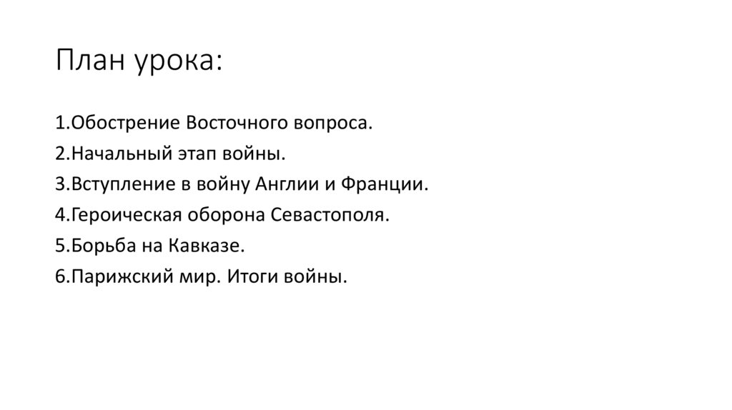 План урока:1.Обострение Восточного вопроса.