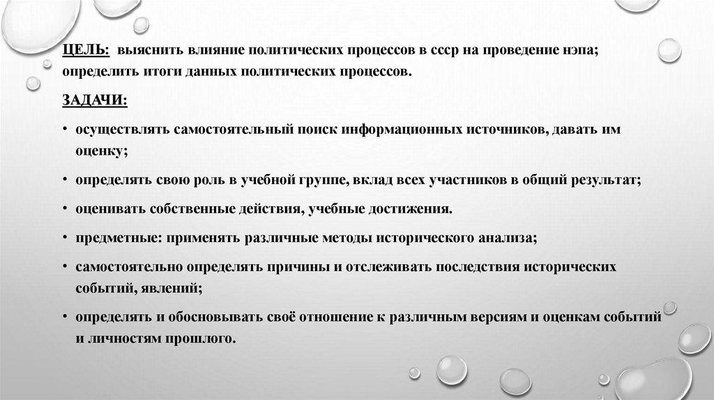 ЦЕЛЬ: выяснить влияние политических процессов в ссср на проведение нэпа;определить итоги данных политических процессов.