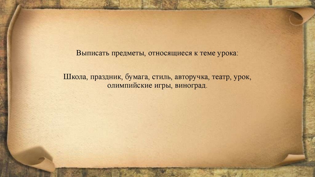 Выписать предметы, относящиеся к теме урока:Школа, праздник, бумага, стиль, авторучка, театр, урок,