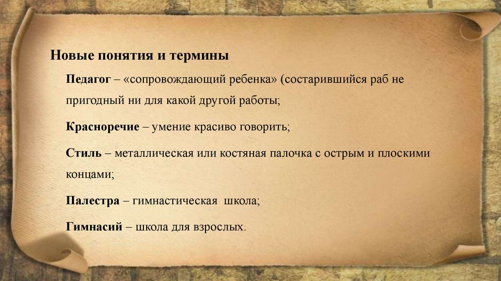 Новые понятия и терминыПедагог – «сопровождающий ребенка» (состарившийся раб не