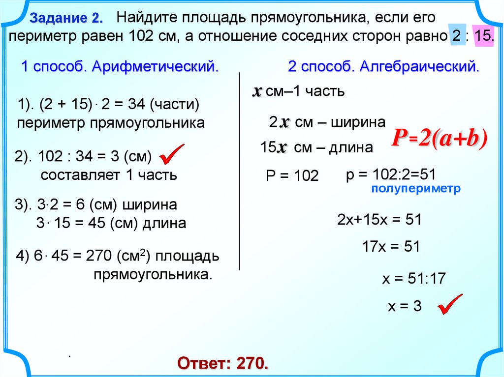 Задание 2. Найдите площадь прямоугольника, если егопериметр равен 102 см, а отношение соседних сторон равно 2 : 15.