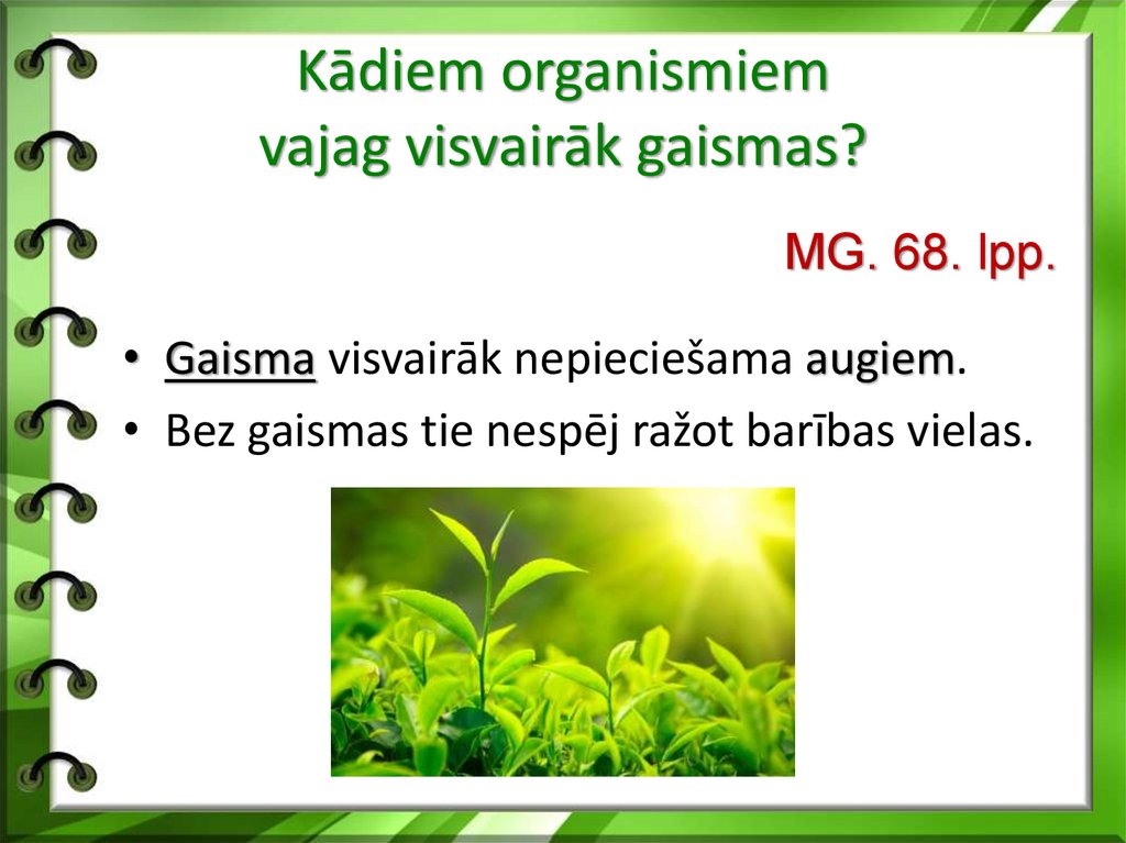 • Gaisma visvairāk nepieciešama augiem.