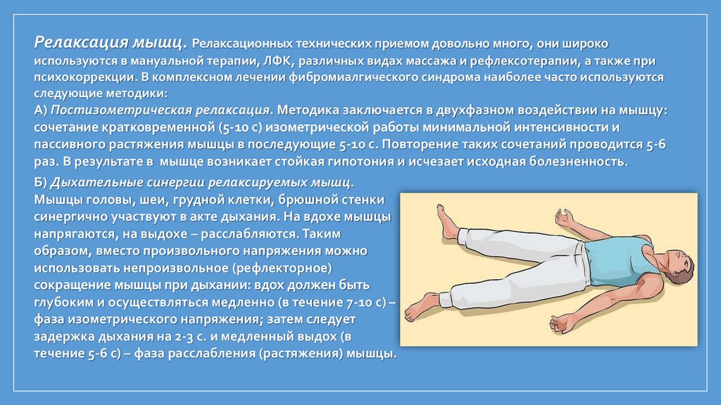 Релаксация мышц. Релаксационных технических приемом довольно много, они широкоиспользуются в мануальной терапии, ЛФК, различных видах массажа и рефлексотерапии, а также при