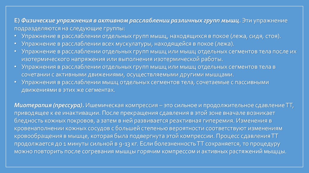 Миотерапия (прессура). Ишемическая компрессия – это сильное и продолжительное сдавление ТТ,