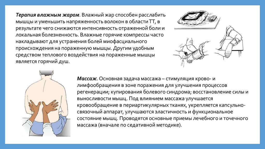Терапия влажным жаром. Влажный жар способен расслабитьмышцы и уменьшить напряженность волокон в области ТТ, в
