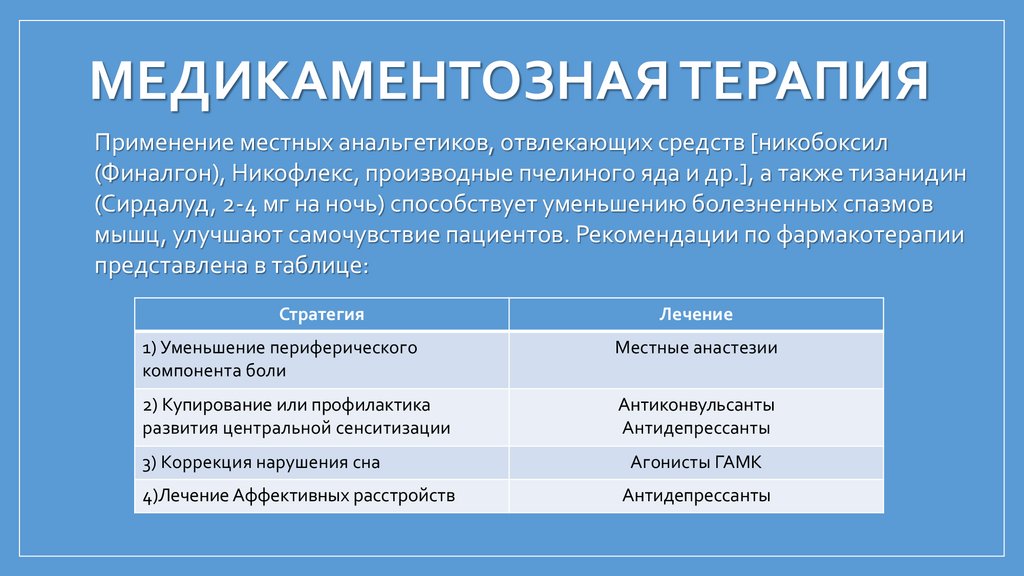(Финалгон), Никофлекс, производные пчелиного яда и др.], а также тизанидин