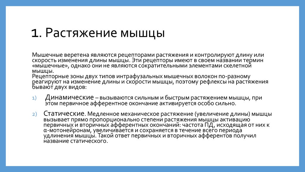 1. Растяжение мышцыМышечные веретена являются рецепторами растяжения и контролируют длину или