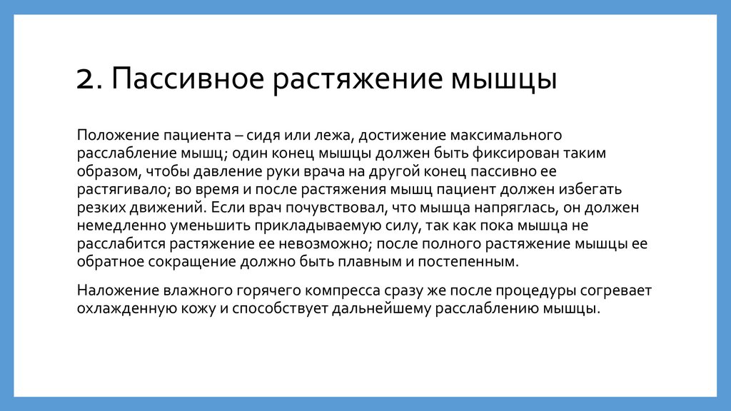 2. Пассивное растяжение мышцыПоложение пациента – сидя или лежа, достижение максимального