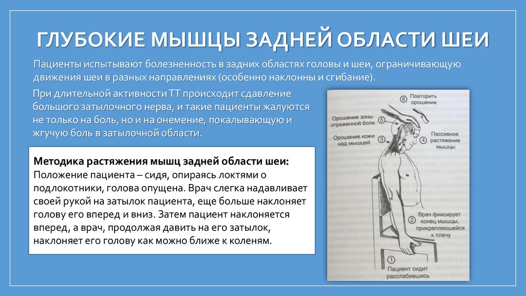 ГЛУБОКИЕ МЫШЦЫ ЗАДНЕЙ ОБЛАСТИ ШЕИПациенты испытывают болезненность в задних областях головы и шеи, ограничивающую