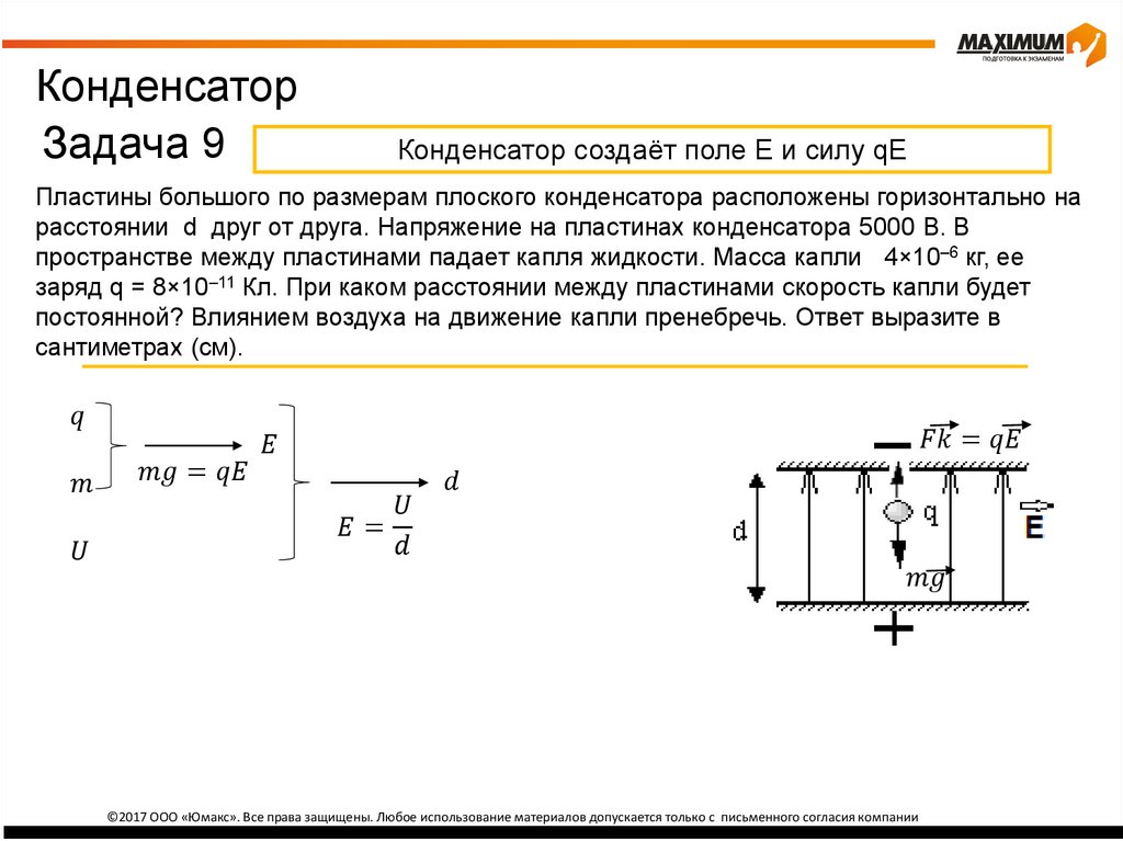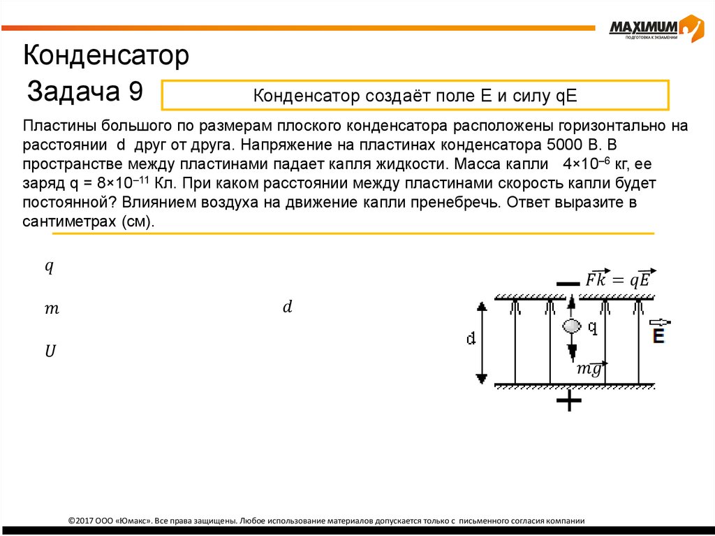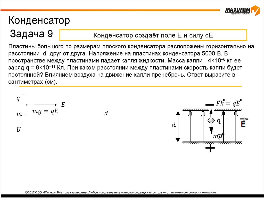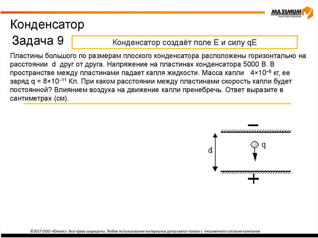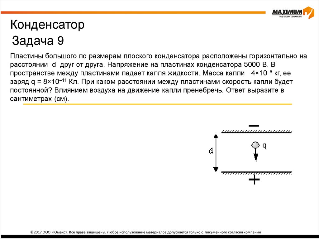 заряд q = 8×10–11 Кл. При каком расстоянии между пластинами скорость капли будет