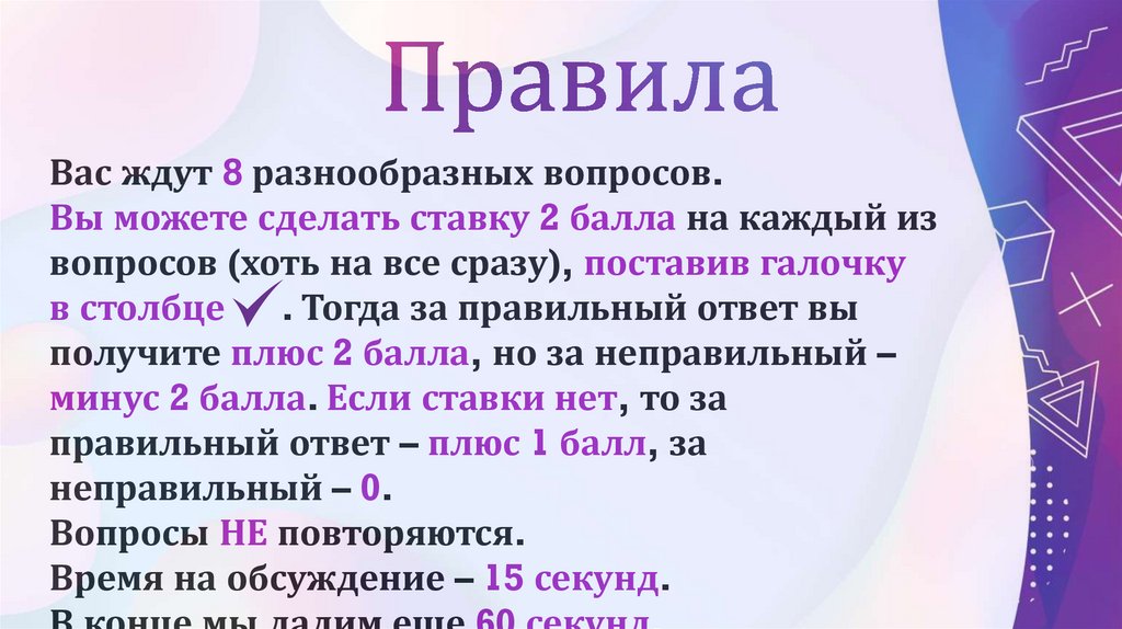 Вас ждут 8 разнообразных вопросов.Вы можете сделать ставку 2 балла на каждый из