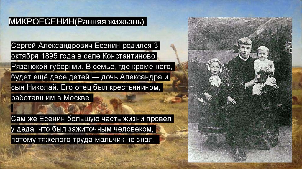 МИКРОЕСЕНИН(Ранняя жижьзнь)Сергей Александрович Есенин родился 3