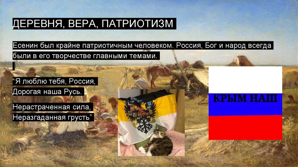 ДЕРЕВНЯ, ВЕРА, ПАТРИОТИЗМЕсенин был крайне патриотичным человеком. Россия, Бог и народ всегда