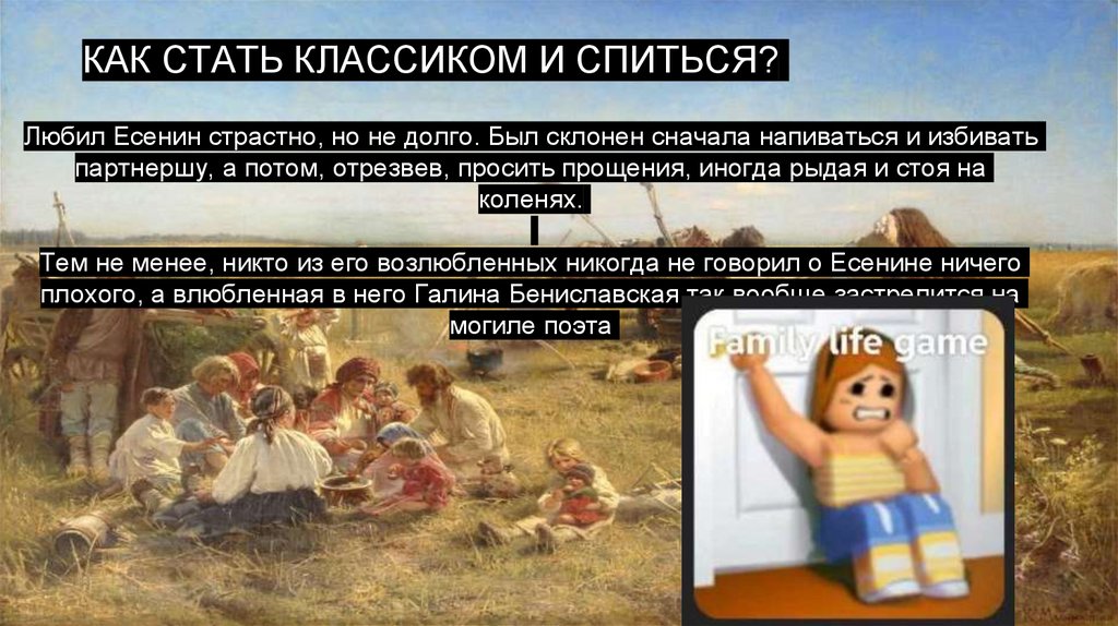 КАК СТАТЬ КЛАССИКОМ И СПИТЬСЯ?Любил Есенин страстно, но не долго. Был склонен сначала напиваться и избивать