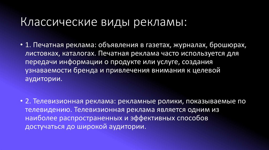 Классические виды рекламы:• 1. Печатная реклама: объявления в газетах, журналах, брошюрах,