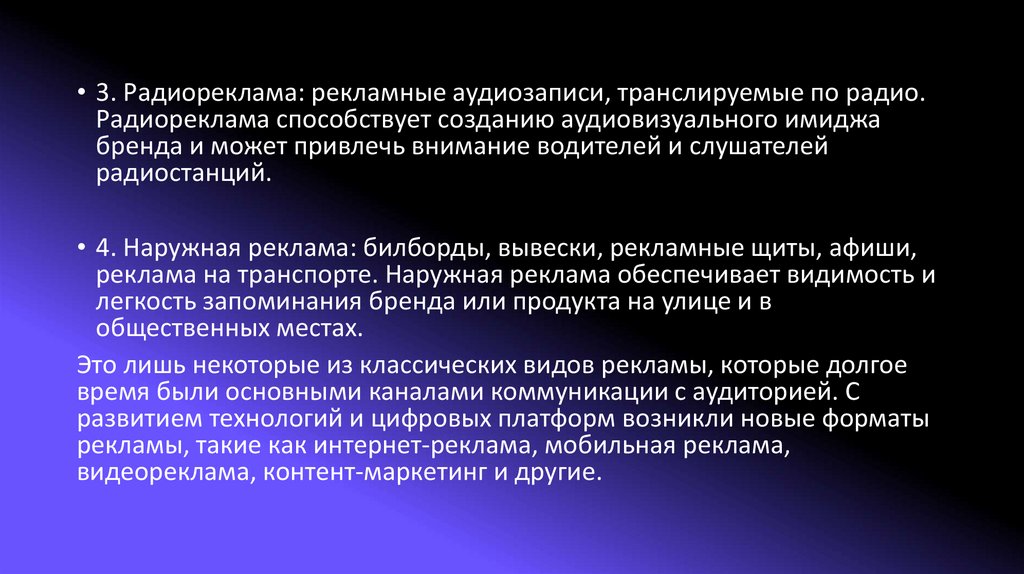 • 3. Радиореклама: рекламные аудиозаписи, транслируемые по радио.Радиореклама способствует созданию аудиовизуального имиджа