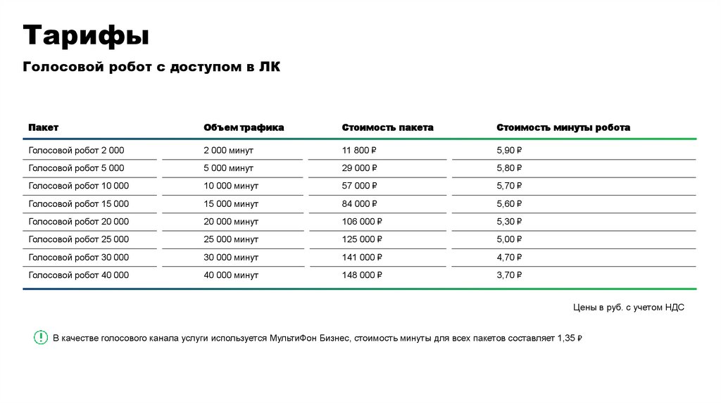 В качестве голосового канала услуги используется МультиФон Бизнес, стоимость минуты для всех пакетов составляет 1,35 ₽